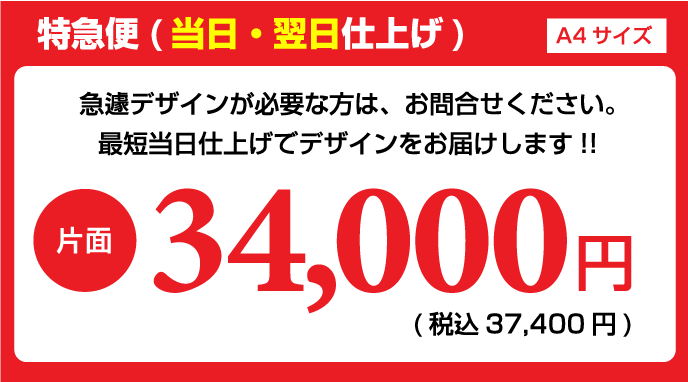 チラシデザイン作成、制作の強み 弊社の一番の強みは、低価格でハイクオリティーなチラシデザインの作成です。一般的な地元神奈川のデザイン会社ですと、チラシデザイン代片面で3万~4万が相場だと思います。 確かに安い業者はあるのですが、クオリティー的にプロとは言えないレベルのデザインの作成をし、一万円以下で販売もしている業者もいますが、対応のスピードや作品の質に疑問を感じます。神奈川チラシ作成.comではデザイナー全員が数年間の実務経験を経験しているデザイナーを多数抱えている為、低価格でのデザイン制作が可能になりました。 制作依頼前にラフデザインをご依頼者様に提出する為、お客様のイメージにより近いチラシのデザインを作成しております。よくお会いしてチラシデザインの打ち合わせをしたいというお客様もいらっしゃいますが、弊社は低価格での提供を考えておりますのでやり取りは、電話やメール、FAXなどで対応しております。また、 修正などもお客様がご納得していただくまで、何度でもチラシデザインの修正を承っております。 続いて、チラシデザインの制作スピードに関しましても、最短で当日・翌日仕上げの特急便、2~3日で完成するお急ぎ便の2種類をご用意しております。 チラシデザインの特急便はA4サイズの場合、片面34000円~でお受けしております。チラシデザインのお急ぎ便は片面25500円~でお受けしております。お急ぎの場合は、是非弊社の担当者までお気軽にお問合せいただければ幸いです。 スピードを求めないのでしたら、弊社で1番のお勧めはチラシ印刷パックをオススメしております。一番安いプランですと、チラシデザイン+印刷でA6サイズ100枚で税抜5980円からオススメしております。A4サイズでの最安パックは、チラシデザイン+印刷+送料込みで100枚で9,100円でお受けしております。 また他に何かわからないことがございましたらなんなりとお気軽にお問合せください。