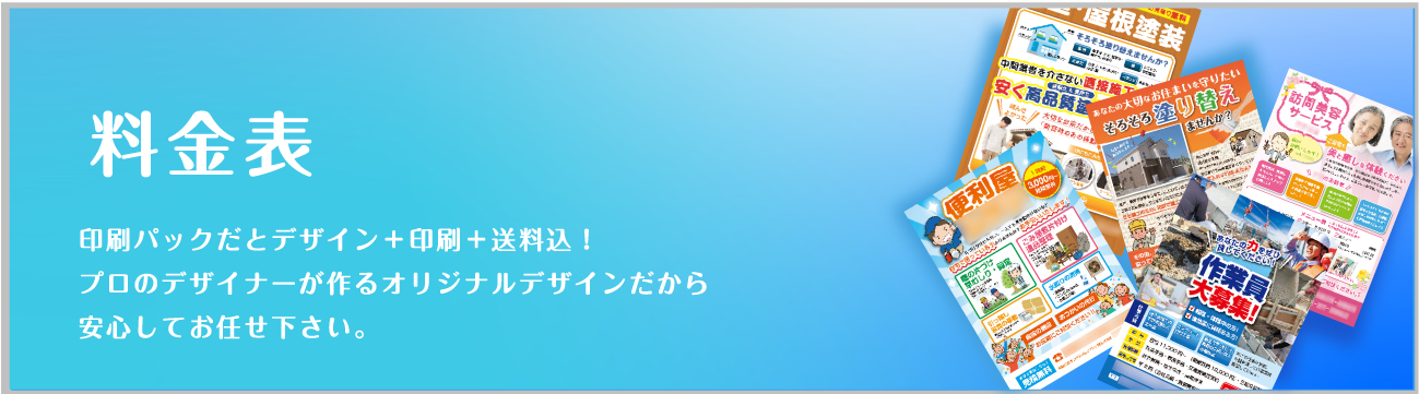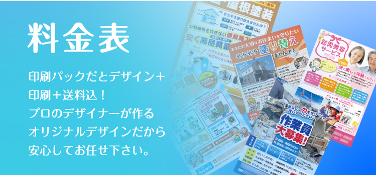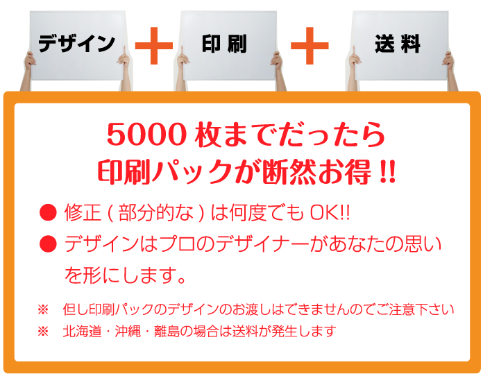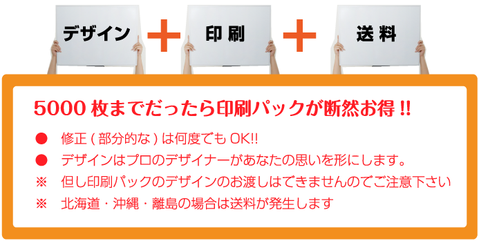 印刷のみも可能ですが、5000枚まででしたらデザインと印刷をセットで頼んだ方がお得になっています。デザインは大切な広告戦略の1つだと思いますので、是非この機会に一度しっかりしたものをお作りになってもいいかもしれませんね。