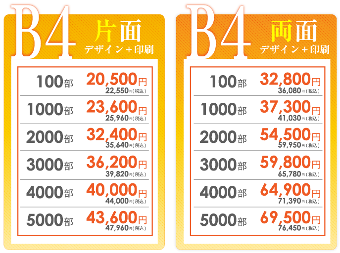 チラシデザイン作成、制作の強み 弊社の一番の強みは、低価格でハイクオリティーなチラシデザインの作成です。一般的な地元神奈川のデザイン会社ですと、チラシデザイン代片面で3万~4万が相場だと思います。 確かに安い業者はあるのですが、クオリティー的にプロとは言えないレベルのデザインの作成をし、一万円以下で販売もしている業者もいますが、対応のスピードや作品の質に疑問を感じます。神奈川チラシ作成.comではデザイナー全員が数年間の実務経験を経験しているデザイナーを多数抱えている為、低価格でのデザイン制作が可能になりました。 制作依頼前にラフデザインをご依頼者様に提出する為、お客様のイメージにより近いチラシのデザインを作成しております。よくお会いしてチラシデザインの打ち合わせをしたいというお客様もいらっしゃいますが、弊社は低価格での提供を考えておりますのでやり取りは、電話やメール、FAXなどで対応しております。また、 修正などもお客様がご納得していただくまで、何度でもチラシデザインの修正を承っております。 続いて、チラシデザインの制作スピードに関しましても、最短で当日・翌日仕上げの特急便、2~3日で完成するお急ぎ便の2種類をご用意しております。 チラシデザインの特急便はA4サイズの場合、片面34000円~でお受けしております。チラシデザインのお急ぎ便は片面25500円~でお受けしております。お急ぎの場合は、是非弊社の担当者までお気軽にお問合せいただければ幸いです。 スピードを求めないのでしたら、弊社で1番のお勧めはチラシ印刷パックをオススメしております。一番安いプランですと、チラシデザイン+印刷でA6サイズ100枚で税抜5980円からオススメしております。A4サイズでの最安パックは、チラシデザイン+印刷+送料込みで100枚で9,100円でお受けしております。 また他に何かわからないことがございましたらなんなりとお気軽にお問合せください。