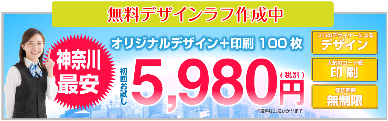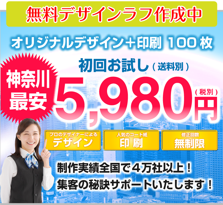 チラシデザイン+印刷で、税抜5980円神奈川県下最安値に挑戦!!チラシお急ぎ納期OK最短納期当日仕上げ対応中!! 神奈川県下同業他社より1円でも高い場合はご相談ください!!誠心誠意対応させて頂きます。チラシのことなら神奈川チラシ作成.com!