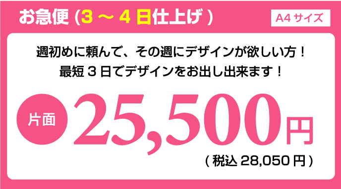 チラシデザイン作成、制作の強み 弊社の一番の強みは、低価格でハイクオリティーなチラシデザインの作成です。一般的な地元神奈川のデザイン会社ですと、チラシデザイン代片面で3万~4万が相場だと思います。 確かに安い業者はあるのですが、クオリティー的にプロとは言えないレベルのデザインの作成をし、一万円以下で販売もしている業者もいますが、対応のスピードや作品の質に疑問を感じます。神奈川チラシ作成.comではデザイナー全員が数年間の実務経験を経験しているデザイナーを多数抱えている為、低価格でのデザイン制作が可能になりました。 制作依頼前にラフデザインをご依頼者様に提出する為、お客様のイメージにより近いチラシのデザインを作成しております。よくお会いしてチラシデザインの打ち合わせをしたいというお客様もいらっしゃいますが、弊社は低価格での提供を考えておりますのでやり取りは、電話やメール、FAXなどで対応しております。また、 修正などもお客様がご納得していただくまで、何度でもチラシデザインの修正を承っております。 続いて、チラシデザインの制作スピードに関しましても、最短で当日・翌日仕上げの特急便、2~3日で完成するお急ぎ便の2種類をご用意しております。 チラシデザインの特急便はA4サイズの場合、片面34000円~でお受けしております。チラシデザインのお急ぎ便は片面25500円~でお受けしております。お急ぎの場合は、是非弊社の担当者までお気軽にお問合せいただければ幸いです。 スピードを求めないのでしたら、弊社で1番のお勧めはチラシ印刷パックをオススメしております。一番安いプランですと、チラシデザイン+印刷でA6サイズ100枚で税抜5980円からオススメしております。A4サイズでの最安パックは、チラシデザイン+印刷+送料込みで100枚で9,100円でお受けしております。 また他に何かわからないことがございましたらなんなりとお気軽にお問合せください。